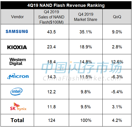 2019年四季度的数据显示,三星在NAND Flash存储芯片市场占有的市场份额高达35.1%,第二名的KIOXIA(东芝)占有的市场份额为18.0%,可以说三星在该市场可谓独领风骚。