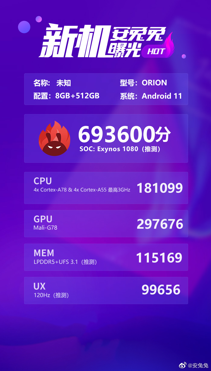 此外,安兔兔还晒出了一张疑似三星Exynos 1080的跑分成绩,高达693600的分数在当前行业中绝对是顶尖般的存在。毫无疑问,搭载这款处理器的手机将无惧各种重度使用场景。同时在这张跑分图中还可以注意到,搭载三星Exynos 1080的这款机型,还疑似配备了120Hz高刷新率屏幕、LPDDR5内存、UFS 3.1闪存等行业顶级配置。这些信息从侧面证明了三星Exynos 1080将会首发搭载于旗舰新品之上。